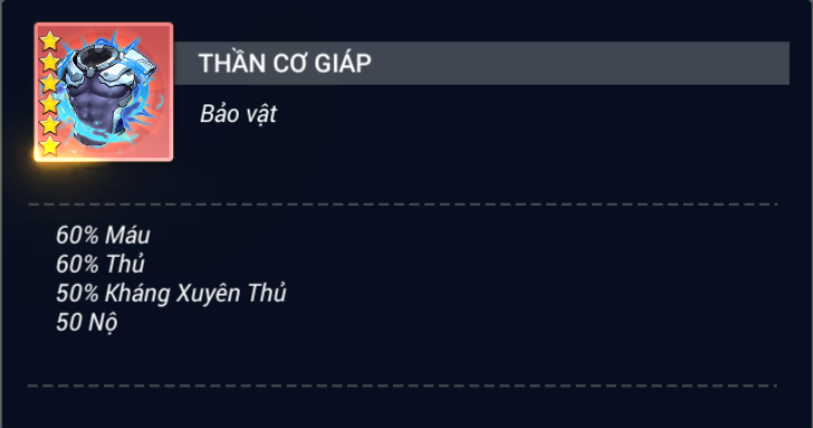 Trong 3 lượt đầu trận đấu, khi bản thân nhận sát thương chí tử lần đầu sẽ không bị hạ gục mà sẽ hồi lại 25% máu tối đa. (tái kích hoạt mỗi khi bắt đầu hiệp mới).