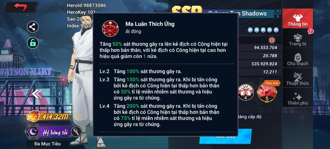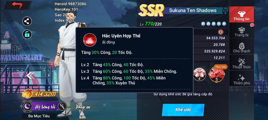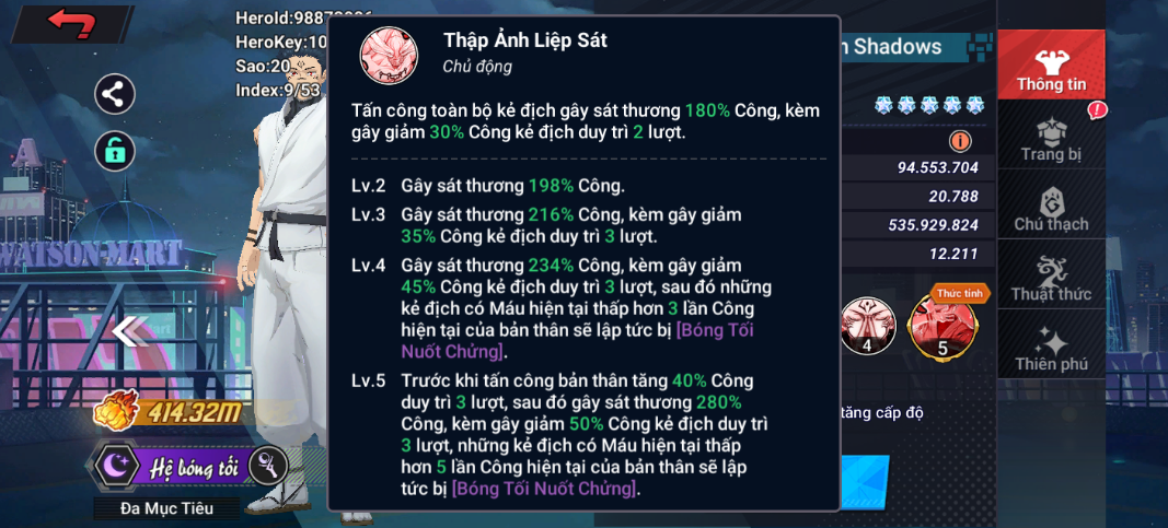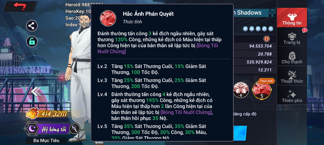 Lv3: Cường hóa [Hắc Uyên Hợp Thể], tăng thêm 40% Công, 30 Tốc Độ, 10% Miễn Chống và các đòn đánh của bản thân có 35% tỉ lệ bỏ qua hiệu quả [Giới Hạn] của mục tiêu