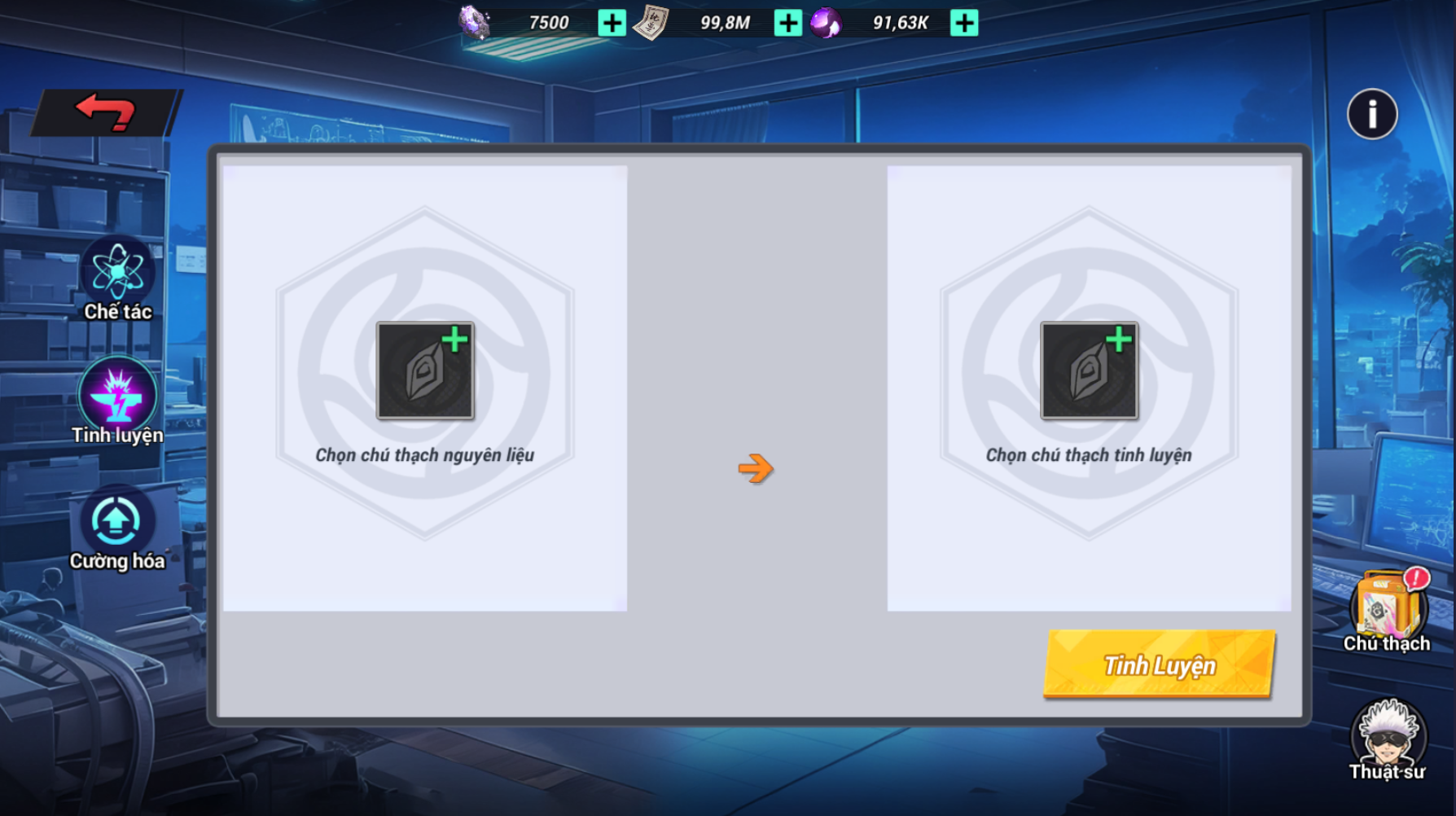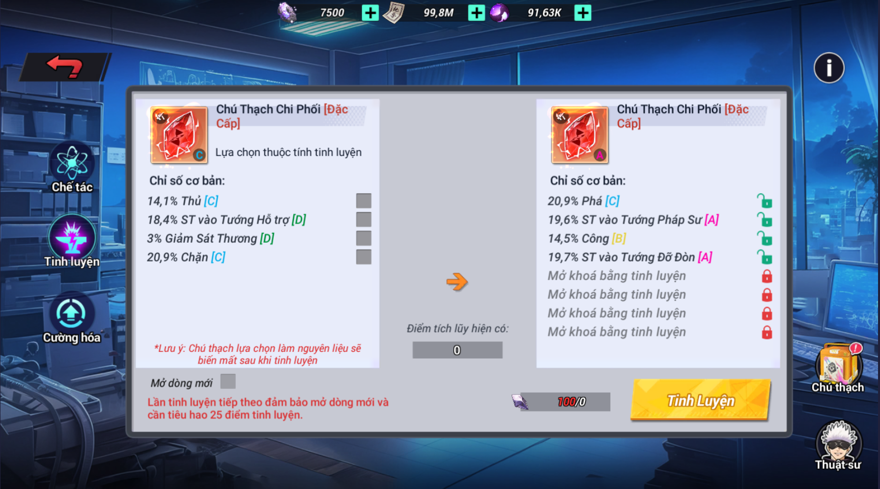 - Trong giao diện tinh luyện cần chọn 2 chú thạch: chú thạch chính và chú thạch nguyên liệu, 2 loại chú thạch yêu cầu cùng phẩm chất và cùng nghề.