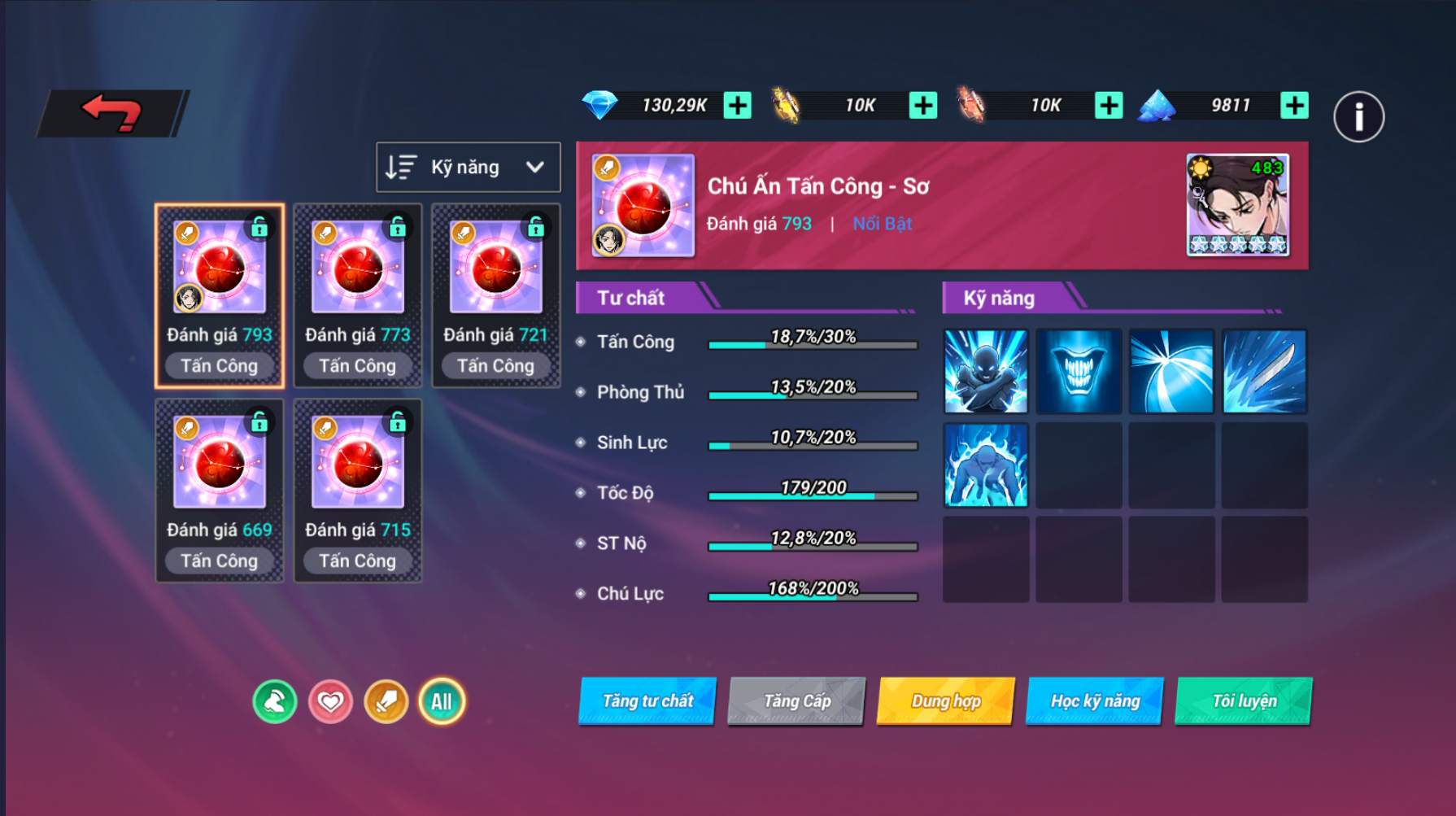 - Chú Ấn Độc Quyền đạt 8 đến 10 kỹ năng có thể tăng lên bậc Trung